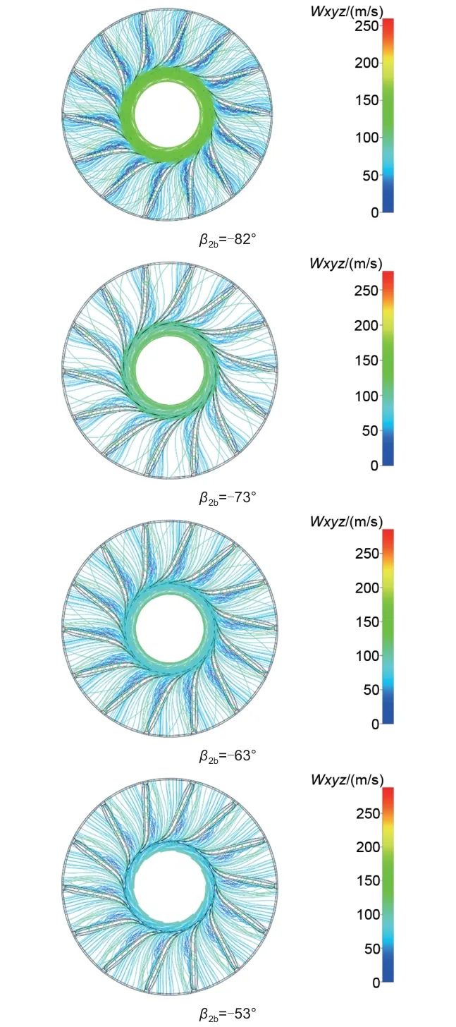 不同葉輪出口角下20%葉高處的流線分布如圖13所示,當(dāng)葉輪出口角由-82°變化到-53°時,葉片吸力面的渦尺度逐漸減小,葉輪出口相對速度逐漸減小,葉輪出口處的流動逐漸惡化且渦面積逐漸增加,在-53°時可以在葉輪出口處觀察到明顯的渦分布。50%葉高處的流線分布如圖14所示,葉片吸力面均有渦分布,且隨著葉輪出口角的增加,葉輪出口處的渦面積逐漸擴(kuò)大。80%葉高處的流線分布如圖15所示,葉輪出口處的渦不明顯,但葉輪吸力面渦分布較葉根和葉中處的明顯。因此對于該CO2向心透平,葉輪出口處的渦分布主要集中在葉根和葉中處,吸力面處的渦分布主要集中在葉頂處。隨著葉輪出口角變化,總的渦損失先減小后增加,在-73°時透平性能最優(yōu)。