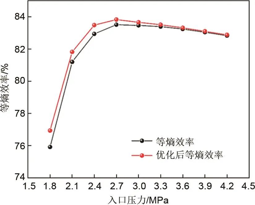 優(yōu)化葉輪入口角和出口角后,該CO2向心透平在設(shè)計點(diǎn)的等熵效率較初始設(shè)計提升了0.75%。為詳細(xì)分析該透平的性能變化,需要對非設(shè)計工況進(jìn)行驗(yàn)證。采用與原設(shè)計相同的變工況模擬,入口壓力由1.8 MPa增加到4.2 MPa,其他邊界條件保持不變。優(yōu)化后透平的等熵效率變化如圖16所示。除了高膨脹比工況外,優(yōu)化后CO2向心透平等熵效率得到提升,且在低膨脹比工況下透平等熵效率的提高幅度在0.31%~1.02%之間,有利于二氧化碳儲能系統(tǒng)在高壓儲罐壓力降低的情況下穩(wěn)定運(yùn)行。