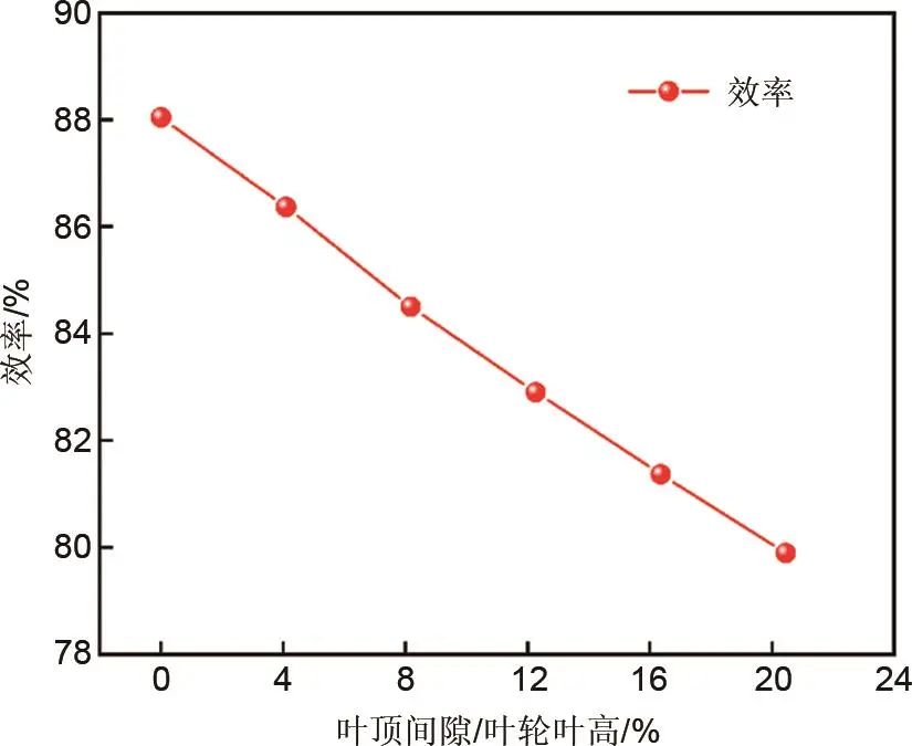 不同葉頂間隙對于透平效率的影響如圖17所示,當(dāng)葉頂間隙從0增加到0.5 mm,葉頂間隙與葉輪葉高的比值從0%增加到20.4%,CO2向心透平的效率由88.04%降低到79.89%,該向心透平效率隨著葉頂間隙的增加而線性遞減。葉頂間隙每增加1%,透平效率相對降低0.40%。