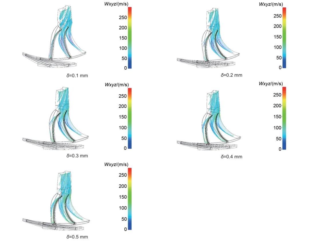 不同葉頂間隙下,垂直于葉片的截面流線分布如圖18所示。隨著葉頂間隙的增加,壓力面與吸力面之間的泄漏量增加且壓力梯度逐漸縮小。此外吸力面的泄漏渦面積逐漸增加,在葉頂間隙為0.1 mm時泄漏渦分布不明顯,當(dāng)葉頂間隙為0.4 mm、0.5 mm時,可以觀察到明顯的泄漏渦分布,且泄漏渦距離吸力面的距離隨著間隙的增加而增加。不同葉頂間隙下葉輪內(nèi)的流線分布如圖19所示。隨著葉頂間隙的增加,泄漏流的流速及其所占流道面積均增加,泄漏流對于主流的阻礙作用更加明顯。主流由于泄漏流而產(chǎn)生偏轉(zhuǎn),使得葉輪不能很好地引導(dǎo)流動方向,因此透平內(nèi)的損失增加。