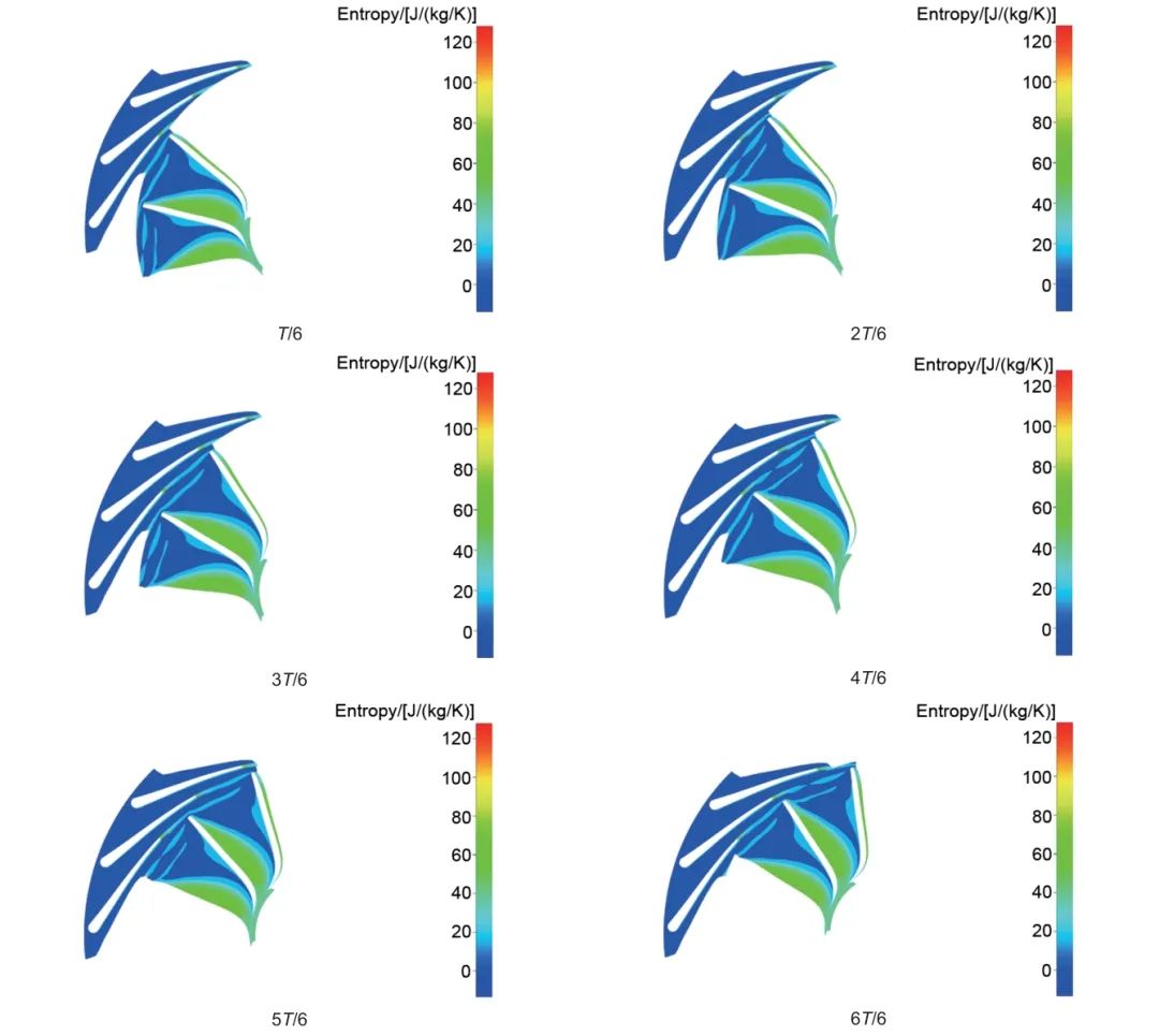 NLH模擬與定常模擬的結(jié)果對比如表6所示,考慮非定常效應(yīng)的影響,透平效率降低0.23%,功率和質(zhì)量流量略有下降。采用熵產(chǎn)方法可以揭示非定常相互作用的機(jī)理,不同時刻的熵值分布如圖20所示,噴嘴區(qū)域的熵產(chǎn)較低,高熵產(chǎn)區(qū)域主要集中在葉輪吸力面前緣及其流道中后部,噴嘴尾跡流呈現(xiàn)周期性變化。噴嘴尾跡流在葉片前緣被分割,且由于吸力面與壓力面的流速不同,尾跡流在剪切作用下形成片段,沿著壓力面和吸力面向下游傳播,從而引起下游流道的熵值變化。