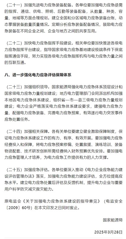 中國儲能網(wǎng)訊:在“雙碳”目標(biāo)與能源革命的浪潮中,中國儲能產(chǎn)業(yè)正迎來黃金發(fā)展期。5月20日,國家能源局重磅發(fā)布《關(guān)于進(jìn)一步加強(qiáng)電力應(yīng)急體系和能力建設(shè)的指導(dǎo)意見》,為儲能技術(shù)的大規(guī)模商業(yè)化應(yīng)用按下加速鍵。這份文件不僅勾勒出電力應(yīng)急體系建設(shè)的清晰路徑,更從政策扶持、標(biāo)準(zhǔn)制定、技術(shù)創(chuàng)新、市場培育等多方面,為儲能產(chǎn)業(yè)鋪就了一條高速發(fā)展的新賽道。