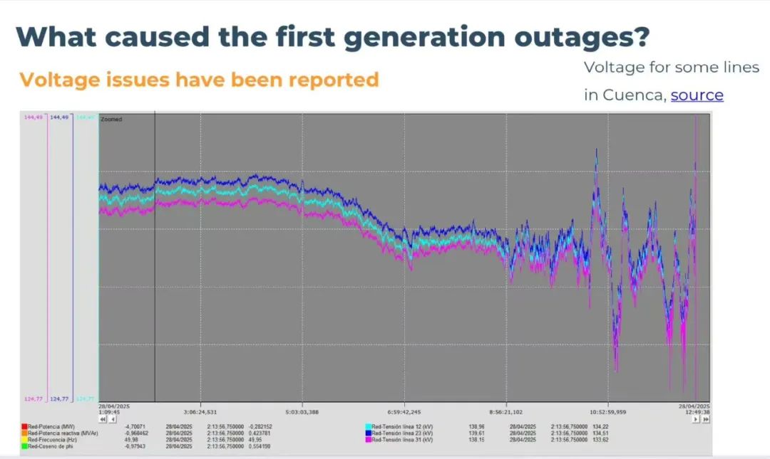 在此過程中,頻率損失速度最大約為0.8Hz/s,沒有超過2Hz/s的界限(歐盟規(guī)定);西班牙電網(wǎng)與主網(wǎng)的相角差持續(xù)擴(kuò)大,但根據(jù)ENTSO-E數(shù)據(jù),系統(tǒng)并未因此立即解列,而是在大量發(fā)電功率驟減后才發(fā)生電網(wǎng)解列。需要指出的是,在故障的關(guān)鍵階段,頻率下降的幅度和速度均未觸發(fā)保護(hù)閾值,因此電網(wǎng)沒有通過切斷負(fù)荷應(yīng)對沖擊,這側(cè)面印證了頻率問題與此次停電事故不一定有直接的因果關(guān)系。