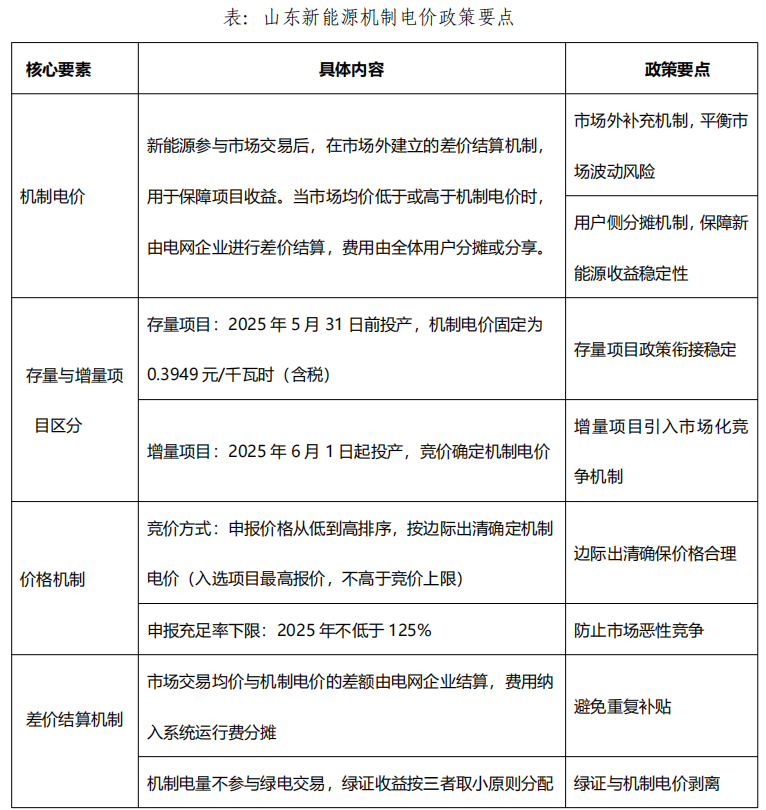 《意見》明確,2025 年 5 月 31 日前投產(chǎn)的存量項(xiàng)目全電量參與市場(chǎng)交易后,機(jī)制電價(jià)按國家政策上限執(zhí)行 0.3949 元/千瓦時(shí)(與山東燃煤基準(zhǔn)價(jià)持平),執(zhí)行期限以項(xiàng)目全生命周期剩余合理利用小時(shí)數(shù)為準(zhǔn)。當(dāng)市場(chǎng)價(jià)低于機(jī)制電價(jià)時(shí),差額由用戶分?jǐn)?;高于時(shí)則由用戶分享收益。