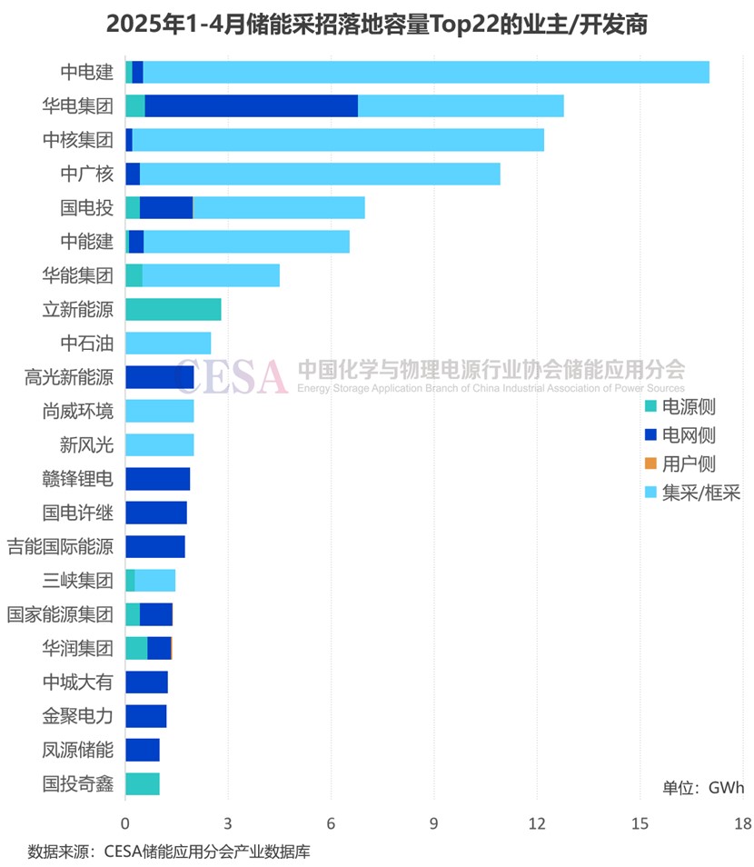 就業(yè)主/開發(fā)商需求分析,2025年1-4月,國內(nèi)共421家企業(yè)完成儲(chǔ)能(含設(shè)備)相關(guān)采招工作。大規(guī)模采購需求主要來自于大型能源央企,其中,中電建、華電集團(tuán)、中核集團(tuán)、中廣核采招落地規(guī)模均在10GWh以上,需求最多。國電投、中能建采招落地超6GWh,華能集團(tuán)采招落地規(guī)模在4GWh以上。此外,立新能源、中石油、新風(fēng)光、尚威環(huán)境、高光新能源采招落地規(guī)模均超過2GWh,贛鋒鋰電、國電許繼、吉能國際能源、三峽集團(tuán)、國家能源集團(tuán)、華潤集團(tuán)、中城大有、金聚電力、國投奇鑫、鳳源儲(chǔ)能采招落地規(guī)模也都在1GWh以上。