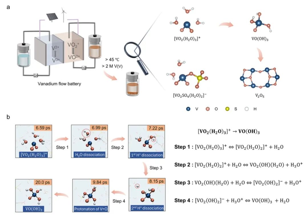 研究發(fā)現(xiàn),水合V(V)離子([VO2(H2O)3]+)在高溫和高濃度下會經(jīng)脫水、去質(zhì)子和質(zhì)子轉(zhuǎn)移過程,最終形成沉淀前驅(qū)體的偏釩酸(VO(OH)3)。第二次脫質(zhì)子反應(yīng)能壘最高,是反應(yīng)的速率決定步驟。相比之下,硫酸根配位的V(V) 離子可有效抑制水分子的極化及后續(xù)去質(zhì)子化過程,從而在高溫環(huán)境下表現(xiàn)出優(yōu)異的穩(wěn)定性?;谏鲜鰴C(jī)理,團(tuán)隊(duì)開發(fā)出混合酸釩電解液(2 MV),在50°C條件下實(shí)現(xiàn)單電池穩(wěn)定運(yùn)行3,000次以上。本研究不僅揭示了V(V) 溶劑化結(jié)構(gòu)的轉(zhuǎn)化機(jī)理,同時(shí)為提高電解液的穩(wěn)定性,以及進(jìn)一步提升VFB系統(tǒng)的可靠性和能量密度具有重要的指導(dǎo)意義。