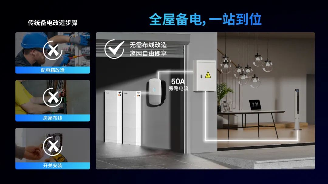 全EPS(應(yīng)急電源)支持全屋備用電源,具備50A旁路電流,為當(dāng)前及未來的用電需求提供充分保障。系統(tǒng)無需重新布線或電路升級,即可實現(xiàn)無縫接入。同時,HIT系列采用小巧靈活的新型電表,插拔式接入配電箱,顯著簡化安裝流程,節(jié)省施工時間。