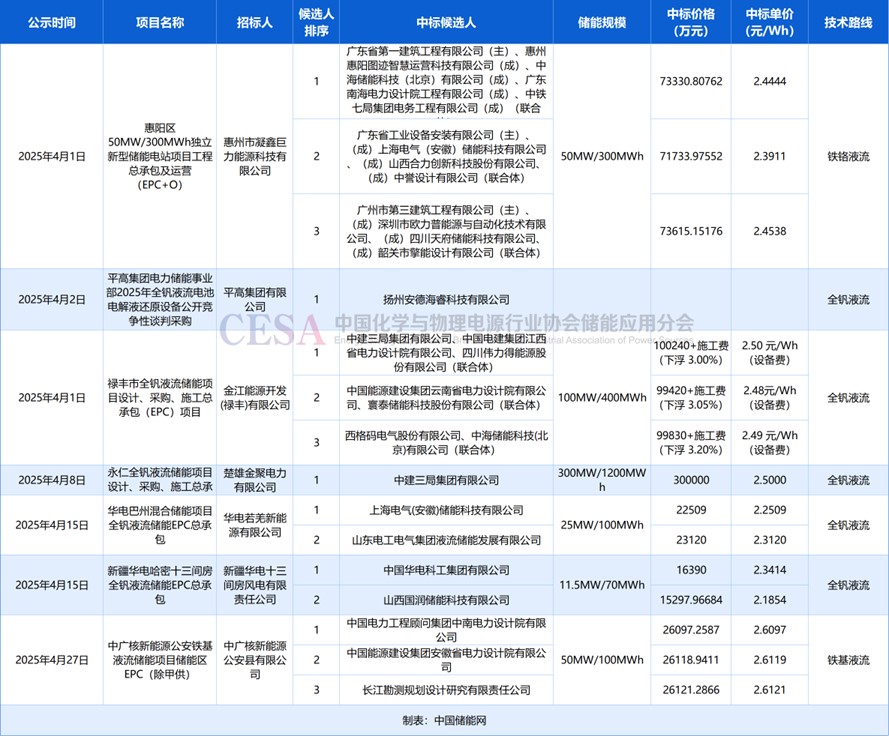 表 2025年4月液流電池儲(chǔ)能項(xiàng)目采招落地規(guī)模及價(jià)格