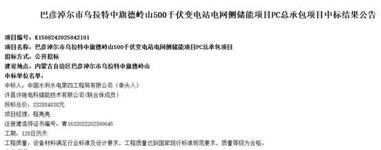 中國儲能網(wǎng)訊:2024年5月27日,內(nèi)蒙古巴彥淖爾市烏拉特中旗德嶺山儲能項目PC總承包中標(biāo)結(jié)果正式揭曉,中國水利水電第四工程局與許昌許繼電科儲能技術(shù)有限公司組成的聯(lián)合體憑借23288.4838萬元、折合單價0.582元/Wh的報價成功中標(biāo)。