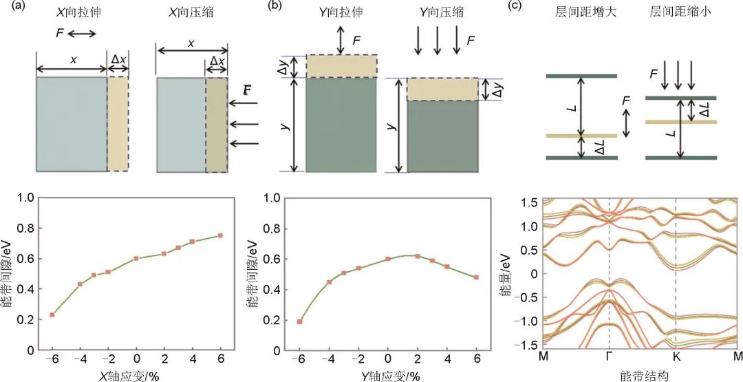 圖2 在橫向X軸、縱向Y軸、層間距Z軸等應(yīng)力作用下雙層GeTe的能帶間隙變化