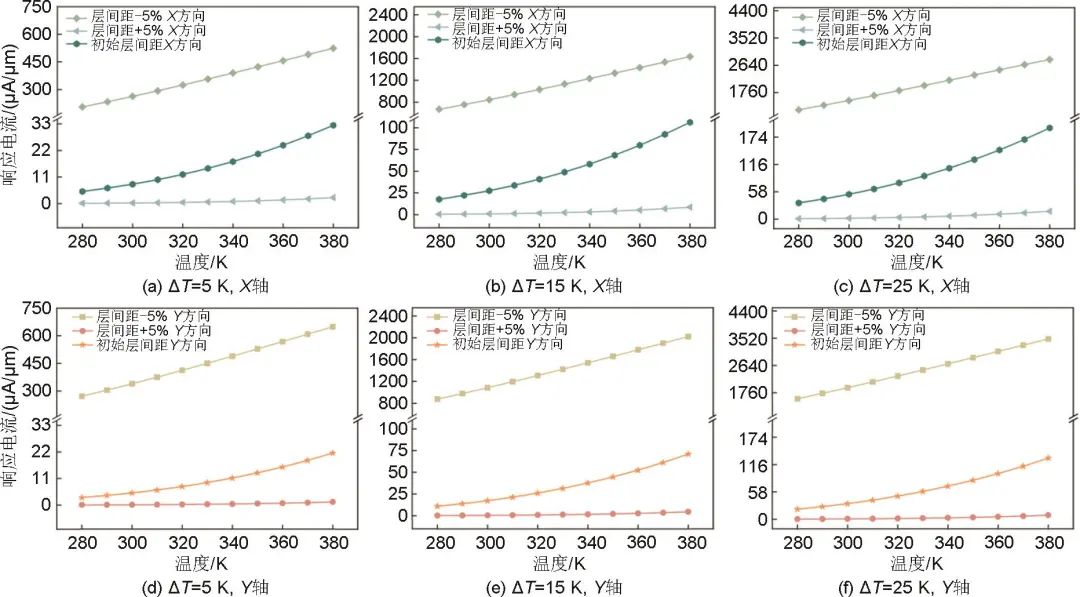 當(dāng)雙層GeTe熱電傳感器件層間距方向上施加了致使層間距增大(縮短)5%的應(yīng)力形變時(shí),熱電響應(yīng)電流隨儲(chǔ)能電池內(nèi)部溫度的增大呈線性增加趨勢(shì)。電池內(nèi)外溫差擴(kuò)大至15 K和20 K時(shí),線性關(guān)系僅存在細(xì)微的差異。如圖5所示,Z軸層間距增加5%會(huì)導(dǎo)致雙層GeTe熱電器件在相同環(huán)境溫度與?T下的響應(yīng)電流擴(kuò)大超10倍,而相較于Z軸層間距縮小5%,雙層GeTe熱電器件在相同環(huán)境溫度與?T下的響應(yīng)電流顯著縮小,且隨環(huán)境溫度的變化而幾乎無明顯改變。相較而言,層間間距對(duì)于器件性能的影響較為顯著,因此,傳感器在Z軸方向的封裝工藝至關(guān)重要。值得注意的是,在熱失控初期的第二階段,電池內(nèi)部壓力增加顯著,但低緯半導(dǎo)體GeTe層間存在強(qiáng)的范德華作用力,表現(xiàn)出較大Z軸彈性系數(shù),因此在合理封裝設(shè)計(jì)條件下Z軸應(yīng)力對(duì)于電池早期熱失控安全預(yù)警性能影響較弱。