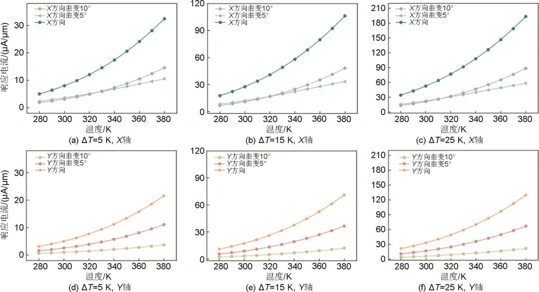 如圖6所示,雙層GeTe熱電器件在X方向和Y方向發(fā)生曲變,同軸向的熱電響應(yīng)電流會(huì)隨著溫度的升高而升高,且曲變后的響應(yīng)信號(hào)較同環(huán)境溫度與?T條件下未曲變時(shí)明顯下降。圖6(a)~(c)顯示,X軸向發(fā)生曲變時(shí),曲變5°、10°時(shí)對(duì)GeTe熱電器件熱電響應(yīng)結(jié)果的影響差別不大,而圖6(d)~(f)則表示Y軸發(fā)生曲變時(shí),10°的曲變誘導(dǎo)GeTe熱電器件Y軸的熱電流發(fā)生更大程度的削減。總體而言,X方向和Y方向的曲變應(yīng)力會(huì)使雙層GeTe熱電器件同軸向熱電響應(yīng)曲線在不同的溫度區(qū)間呈現(xiàn)差異化的變化率。當(dāng)電池內(nèi)部溫度處于熱失控第二階段,傳感器的溫差為25 K時(shí),在曲線應(yīng)力作用下響應(yīng)電流依然是其在正常工作條件下的5倍以上,可實(shí)現(xiàn)儲(chǔ)能電池內(nèi)部微觀“不可逆反應(yīng)”精準(zhǔn)判別。