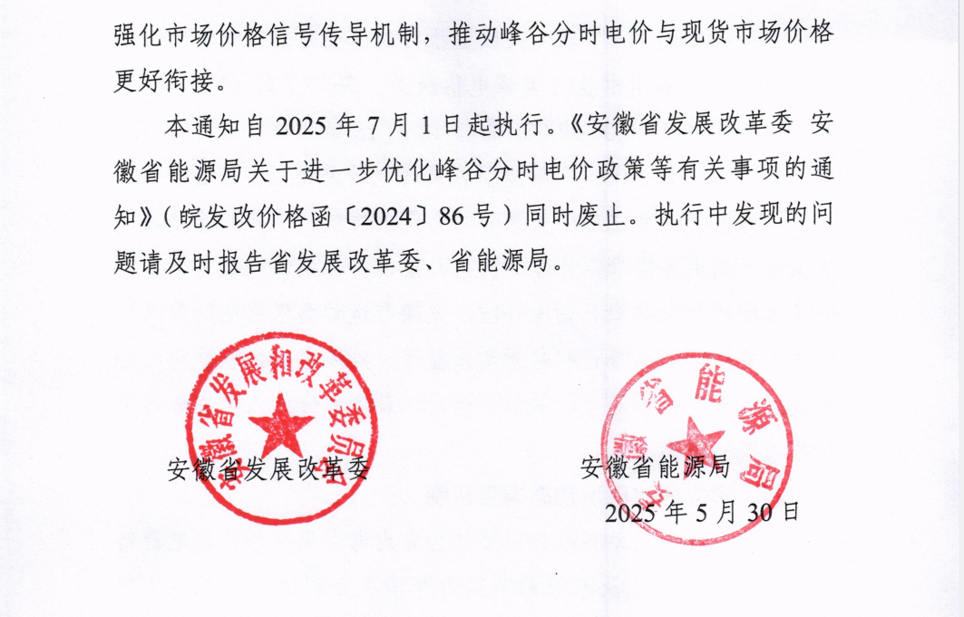 中國(guó)儲(chǔ)能網(wǎng)訊:5月30號(hào),安徽省發(fā)展改革委安徽省能源局關(guān)于進(jìn)一步完善工商業(yè)峰谷分時(shí)電價(jià)政策有關(guān)事項(xiàng)的通知(和征求意稿一致)