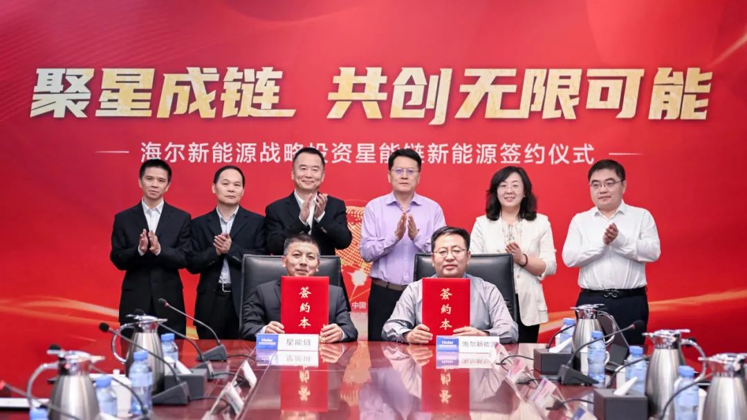 海爾集團(tuán)高級副總裁解居志,海爾新能源副總裁、海爾綠能總經(jīng)理季曉健,海爾儲能總經(jīng)理袁艦,海爾智控器副總經(jīng)理曲桂楠,星能鏈公司創(chuàng)始人李繼祖,星能鏈總經(jīng)理汪錫建,星能鏈CTO 璩克旺,星能鏈企劃和產(chǎn)品副總周皓等出席本次簽約儀式。