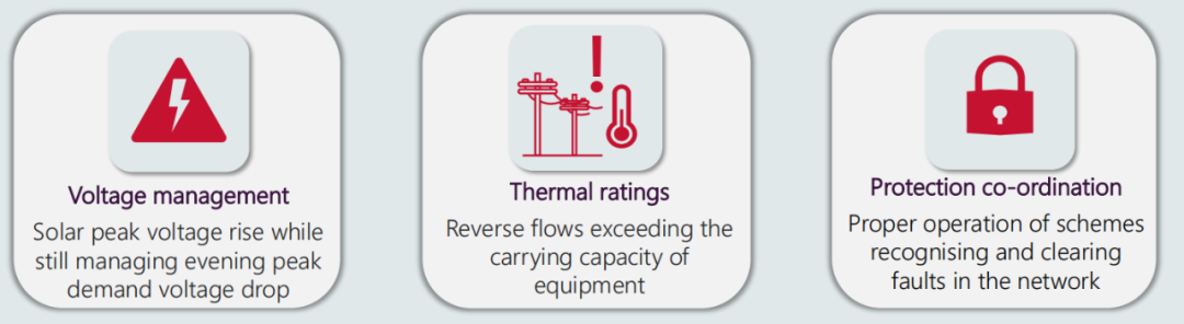 AEMO認為,低壓側分布式光伏反送電到更高電壓等級帶來的問題,包括電壓管理(配電網需要應對光伏大發(fā)對應的電壓和夜晚負荷尖峰時的電壓,二者的電壓范圍過大給配電網運行帶來很大的運行壓力)、反向重過載帶來的熱管理問題以及相應的二次回路問題。