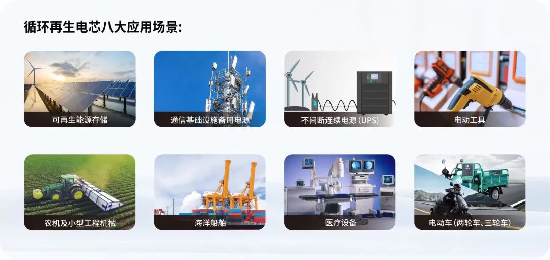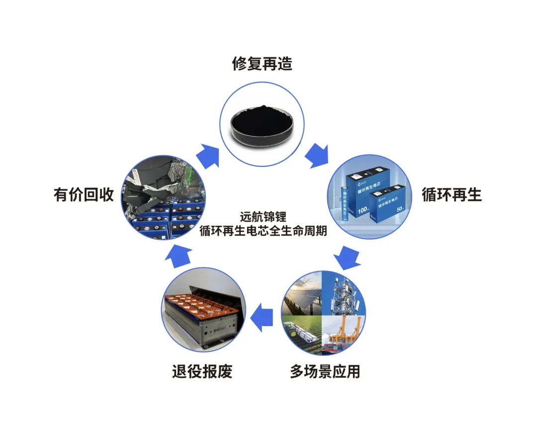 遠(yuǎn)航錦鋰與上下游開展深度的技術(shù)合作,構(gòu)建了覆蓋電芯設(shè)計、電芯生產(chǎn)、電池使用、退役回收的循環(huán)再生體系:依托“智能拆解-無損剝離-有價回收”的產(chǎn)業(yè)技術(shù)鏈,將退役報廢電芯或極片中的正極材料、負(fù)極材料、電解液等成分進(jìn)行高效分離,并創(chuàng)新性運用材料重構(gòu)技術(shù),將回收材料應(yīng)用到性能穩(wěn)定的循環(huán)再生電芯。這些循環(huán)再生電芯已廣泛應(yīng)用于小動力、可再生能源儲能電站、通信基站備用電源、數(shù)據(jù)中心不間斷連續(xù)電源、農(nóng)業(yè)機械及電動工具等場景。
