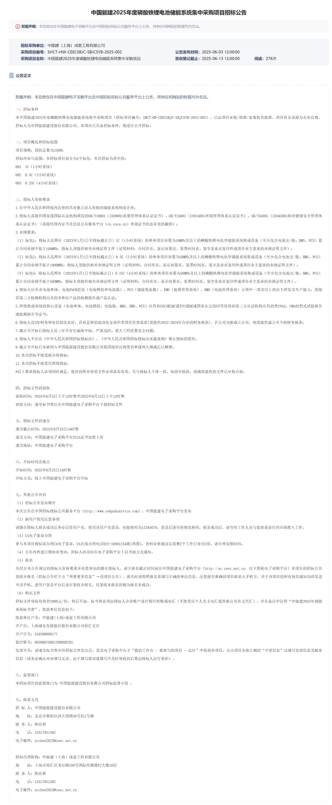 中國儲能網訊:2025年6月3日,中能建(上海)成套工程有限公司發(fā)布中國能建2025年度磷酸鐵鋰電池儲能系統集中采購項目招標公告,本次預估總量為25GWh,劃分為3個標包,本次招標為其中的:標包1為1C(1小時系統)、標包2為0.5C(2小時系統)、標包3為0.25C(4小時系統)。