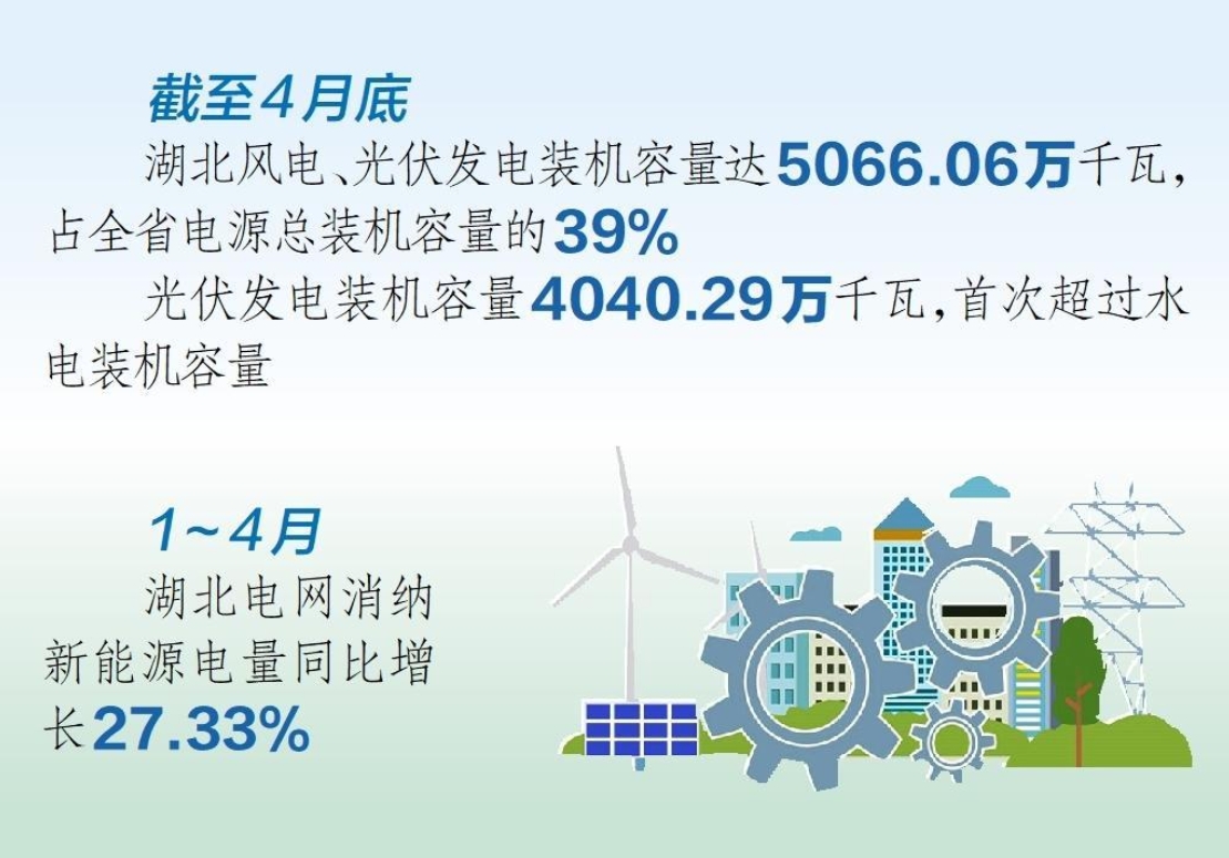 中國(guó)儲(chǔ)能網(wǎng)訊:5月15日從國(guó)網(wǎng)湖北省電力有限公司獲悉,截至4月底,湖北風(fēng)電、光伏發(fā)電裝機(jī)容量達(dá)5066.06萬千瓦,占全省電源總裝機(jī)容量的39%。其中,光伏發(fā)電裝機(jī)容量4040.29萬千瓦,首次超過水電裝機(jī)容量。