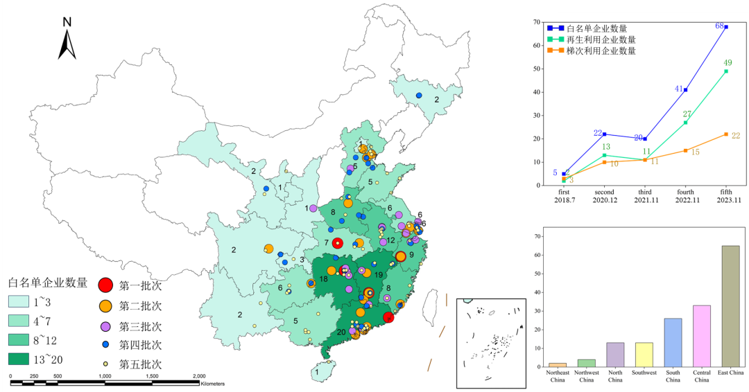 圖6 官方發(fā)布的動(dòng)力電池白名單回收企業(yè)在中國(guó)大陸的分布地圖。(a)為中國(guó)工信部發(fā)布的各批次白名單回收企業(yè)的地理位置;(b)表示每個(gè)批次中業(yè)務(wù)類型的數(shù)量;(c)表示中國(guó)大陸各地區(qū)經(jīng)認(rèn)證的回收企業(yè)總數(shù)