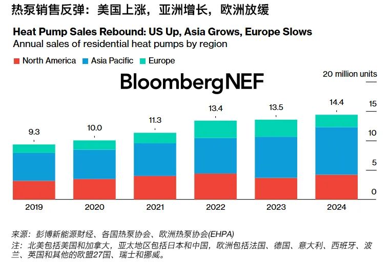 2024年全球熱泵銷量增長(zhǎng)6%,亞太地區(qū)以16%的增幅引領(lǐng)增長(zhǎng),北美地區(qū)也出現(xiàn)反彈。受補(bǔ)貼削減和天然氣價(jià)格下跌的影響,歐洲熱泵銷量下降27%。