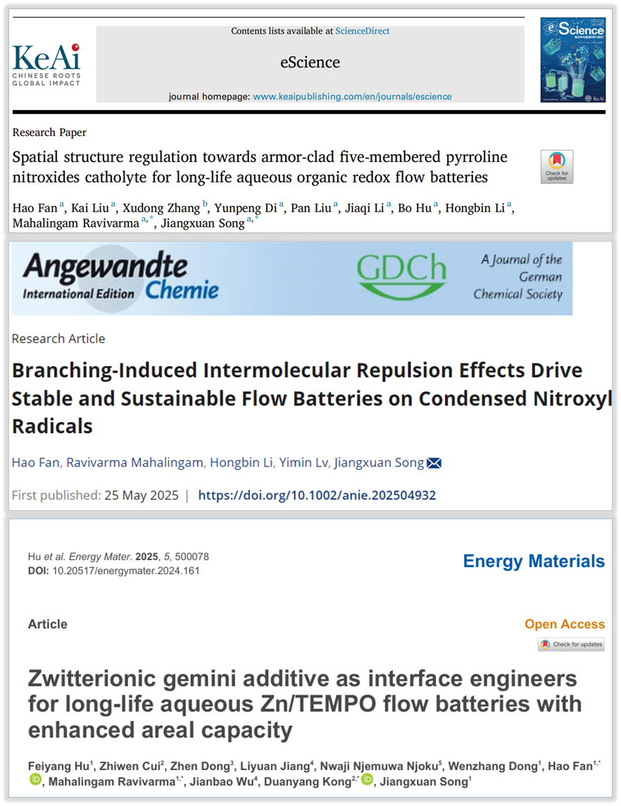 上述研究成果分別以《分子鎧甲化的長(zhǎng)壽命五元吡咯啉氮氧自由基類液流電池正極電解質(zhì)》(Spatial structure regulation towards armor-clad five-membered pyrroline nitroxides catholyte for long-life aqueous organic redox flow batteries)和《分子支鏈調(diào)控驅(qū)動(dòng)氮氧自由基穩(wěn)定轉(zhuǎn)化,助力構(gòu)建高性能水系液流電池》(Branching-Induced Intermolecular Repulsion Effects Drive Stable and Sustainable Flow Batteries on Condensed Nitroxyl Radicals)為題發(fā)表在國(guó)際期刊《電科學(xué)與能源科學(xué)》(eScience)和《德國(guó)應(yīng)用化學(xué)》(Angewandte Chemie International Edition)上;材料科學(xué)與工程學(xué)院范豪副教授為論文第一作者,宋江選教授為通訊作者,西安交通大學(xué)為論文唯一完成單位。