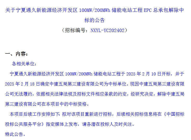 中國儲能網(wǎng)訊:6月10日,關于寧夏通久新能源經(jīng)濟開發(fā)區(qū)100MW/200MWh儲能電站工程EPC總承包解除中標的公告發(fā)布。公告稱,寧夏通久新能源經(jīng)濟開發(fā)區(qū) 100MW/200MWh 儲能電站工程于2025年2月10日開標,并于2025年2月18日確定中建五局第三建設有限公司為中標單位。現(xiàn)因中建五局第三建設有限公司無法履約,依據(jù)相關法律法規(guī)及招標文件相應條款的約定,經(jīng)研究決定,解除中建五局第三建設有限公司在本項目中的中標資格。后續(xù)擬對該項目重新進行招標。