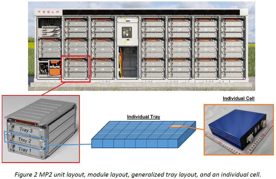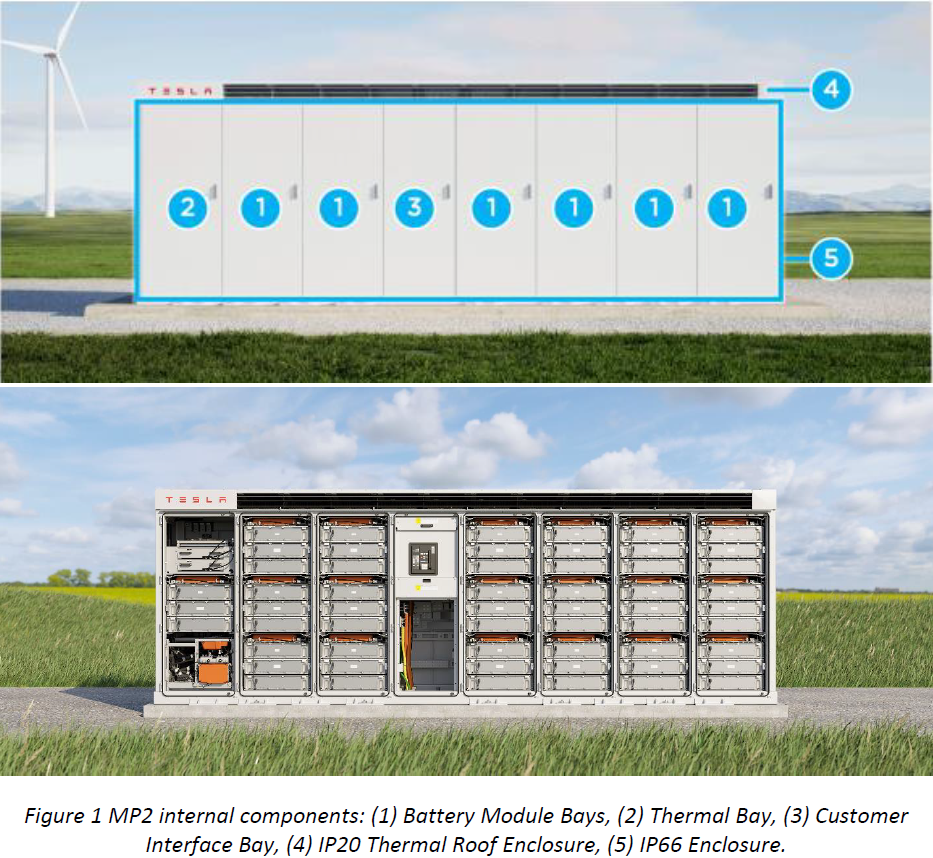 MP2XL是MP2的大容量版,MP2XL配備24個(gè)電池模塊,而MP2只有19個(gè)。除了更大尺寸以容納更多的電池模塊,MP2XL的設(shè)計(jì)幾乎與MP2相同。MP2XL使用與MP2完全相同的電池單體、電池模塊和電力電子設(shè)備(即內(nèi)部所有組件相同)。MP2XL與MP2一樣,由電池模塊、電力電子設(shè)備、熱管理系統(tǒng)和控制系統(tǒng)組成,所有系統(tǒng)預(yù)制化安裝在機(jī)柜內(nèi),機(jī)柜尺寸為長(zhǎng)8800mm、深1650mm、高2785mm,重38.1t。MP2XL與MP2之間的其他細(xì)微差異包括: