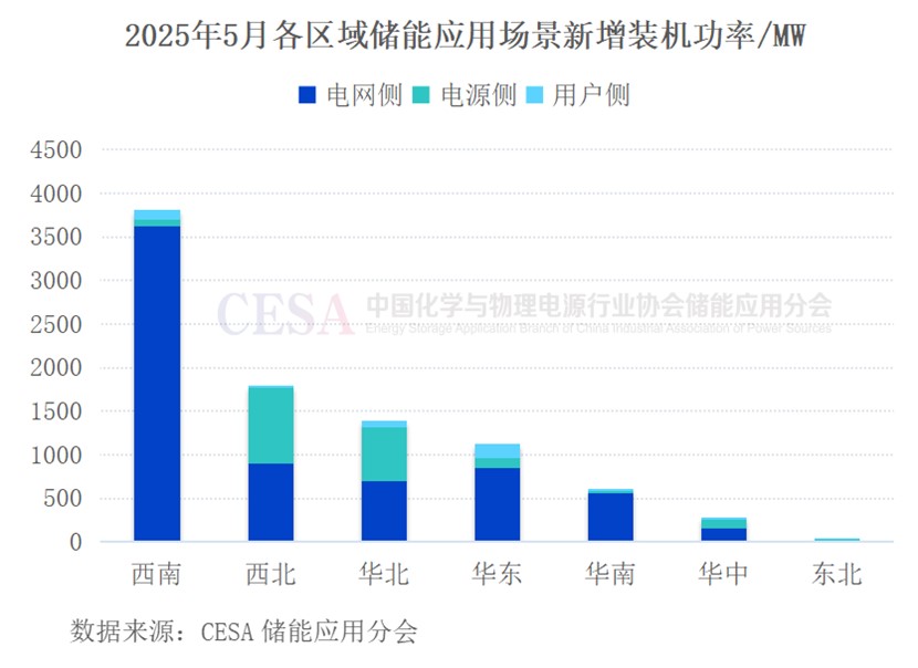 從區(qū)域分布來看,5月西南區(qū)域新增儲能裝機最大,為3.76GW/8.08GWh,功率規(guī)模占比41.08%,容量規(guī)模占比34.93,雙雙位列全國第一,建設(shè)地點主要位于云南,電網(wǎng)側(cè)項目居多。西北區(qū)域新增儲能裝機總規(guī)模為1.78GW/7.23GWh,容量占比31.26%,居全國第二。西北區(qū)域以新能源側(cè)配儲項目為主,建設(shè)地點主要位于新疆和陜西。