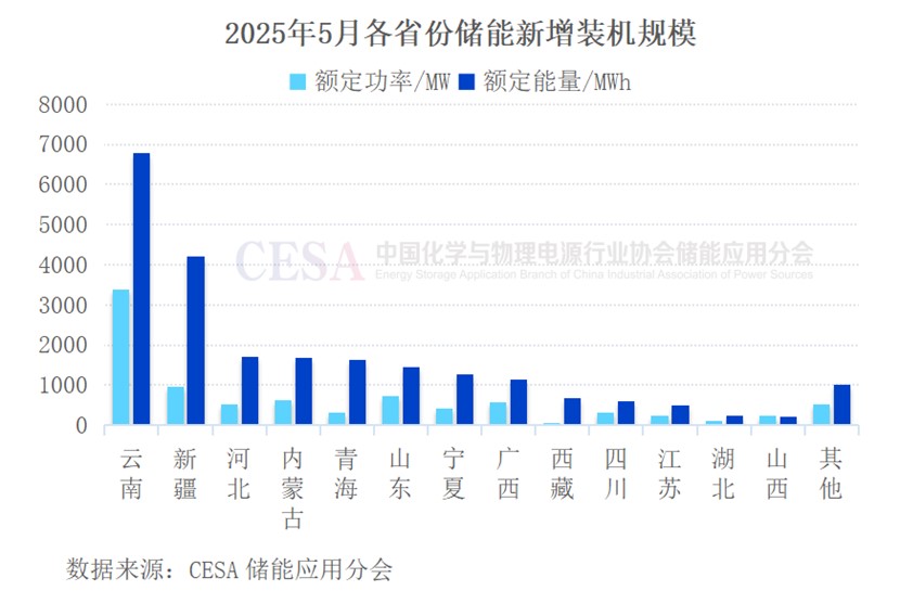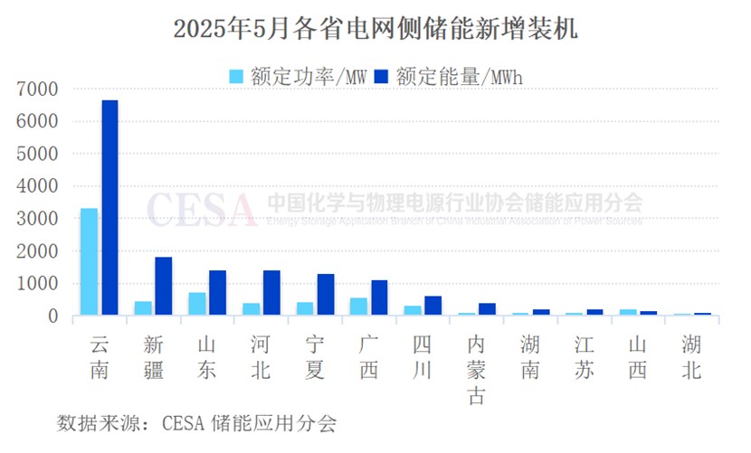 2025年5月,電網(wǎng)側(cè)儲能新增投運項目共45個,總規(guī)模為6.78GW/15.48 GWh,其中35個項目裝機功率在百兆瓦及以上,主要分布在云南、新疆、山東、河北、寧夏、廣西等省份。