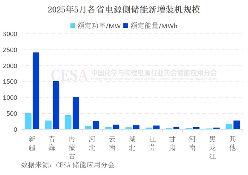 2025年5月,電源側(cè)共新增并網(wǎng)/投運項目50個,總規(guī)模為1.84GW/6.14GWh,其中42個為新能源側(cè)配置儲能項目,容量規(guī)模占電源側(cè)的84.35%。從應(yīng)用場景來看,以光伏配儲項目為主,共計30個,規(guī)模為1.28GW/4.37GWh,容量規(guī)模占電源側(cè)的71.13%;風(fēng)電配儲項目11個,總規(guī)模為0.31GW/0.75GWh;新增風(fēng)光配儲項目1個,規(guī)模為30MW/60MWhh。從分布來看,電源側(cè)項目主要分布在新疆、青海、內(nèi)蒙古、河北、云南、湖北等19省。