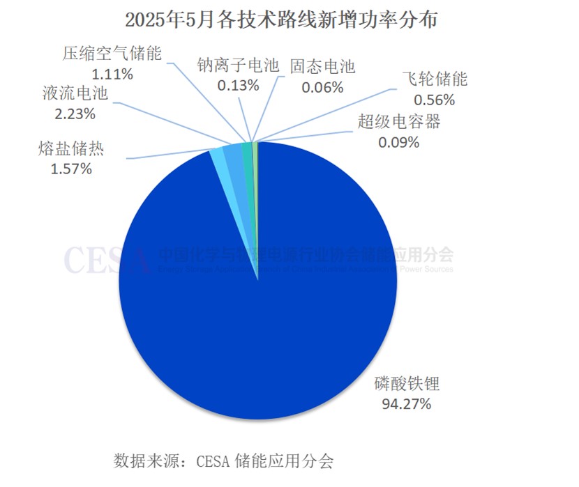 從儲能技術(shù)來看,5月新增投運儲能項目中,磷酸鐵鋰電池儲能項目規(guī)模為8.48GW/19.62GWh,功率占比達(dá)94.27%,仍為新型儲能項目的主要技術(shù)路線。其次,熔鹽儲熱、液流電池和壓縮空氣儲能這三種非鋰長時儲能技術(shù)新增裝機均超1GWh,新增規(guī)模分別為141.1MW/1450.8MWh、200.31MW/1001.22MWh和100MW/1000MWh。