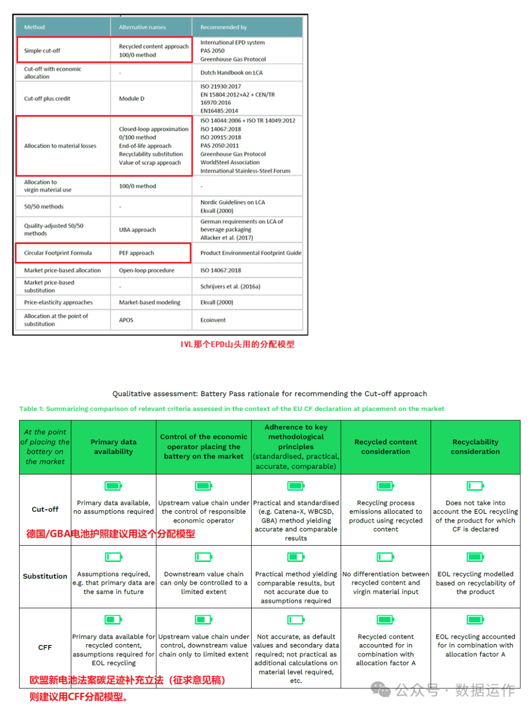 GBA電池護(hù)照的配套碳足跡核算指南Comparison of end-of-life allocation approaches討論了3種分配模型,分別是:Cut-off approach, Substitution approach和Circular Footprint Formula。最終建議使用Cut-off approach(而補(bǔ)充立法征求意見(jiàn)稿則使用CFF法)。