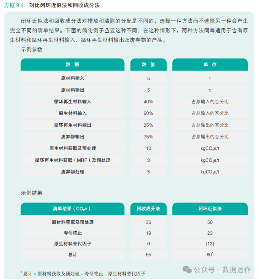 需要注意的是,這個(gè)Cut-off的概念與GB/T 24067中“排放量小所以Cut-off”那個(gè)概念不一樣,這里的Cut-off是指回收利用工序的碳排放量不管多大,一概不計(jì)入。如果生產(chǎn)中使用回收原料,只需要核算所回收原料的再生料產(chǎn)品的碳足跡: