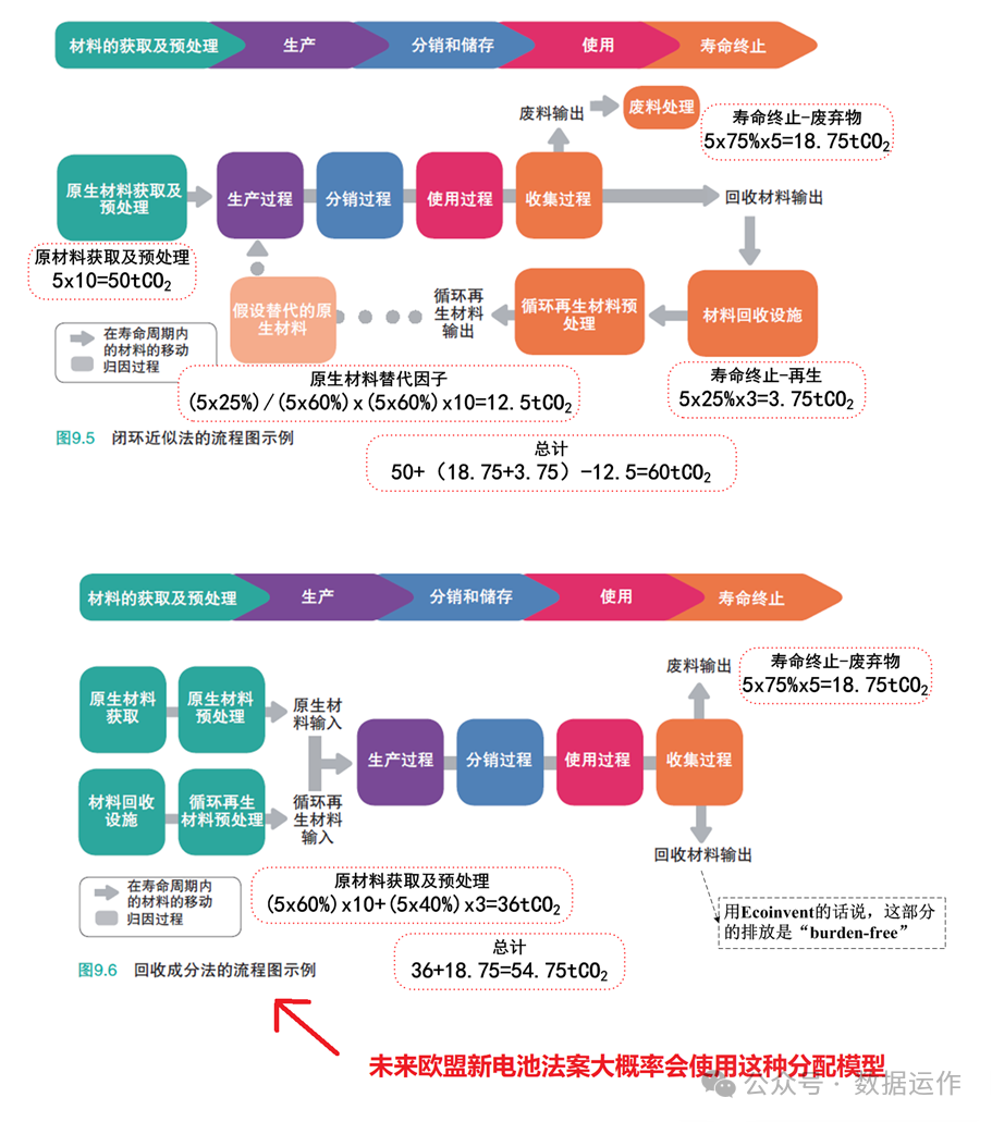 GBA電池護(hù)照的配套碳足跡核算規(guī)則對(duì)于資源循環(huán)利用情況下的分配模型(End-of-life and recycling rules)給出了詳細(xì)的解釋?zhuān)⑶覍?zhuān)門(mén)發(fā)布了分配模型的指南。對(duì)于碳排放在不同產(chǎn)品之間的分?jǐn)偅步o出了比ISO14044更詳細(xì)的原則(雖然在實(shí)踐中仍然可能出現(xiàn)問(wèn)題)。