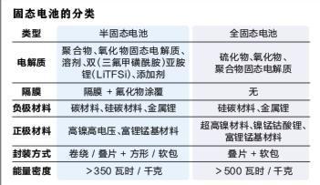 固態(tài)電池主要由正極、負(fù)極和固態(tài)電解質(zhì)三部分組成。其中,正極材料通常采用鋰鈷氧化物、鎳錳鈷酸鋰、富鋰錳基等,負(fù)極材料通常采用金屬鋰或碳材料,固態(tài)電解質(zhì)采用硫化物、氧化物、聚合物等固體材料。根據(jù)固態(tài)電解質(zhì)用量,固態(tài)電池可分為半固態(tài)電池和全固態(tài)電池。通常情況下,液體質(zhì)量占比低于10wt%(質(zhì)量百分比)的電池是半固態(tài)電池,能量密度高于350瓦時(shí)/千克;液體質(zhì)量占比降為0的電池是全固態(tài)電池,能量密度高于500瓦時(shí)/千克。