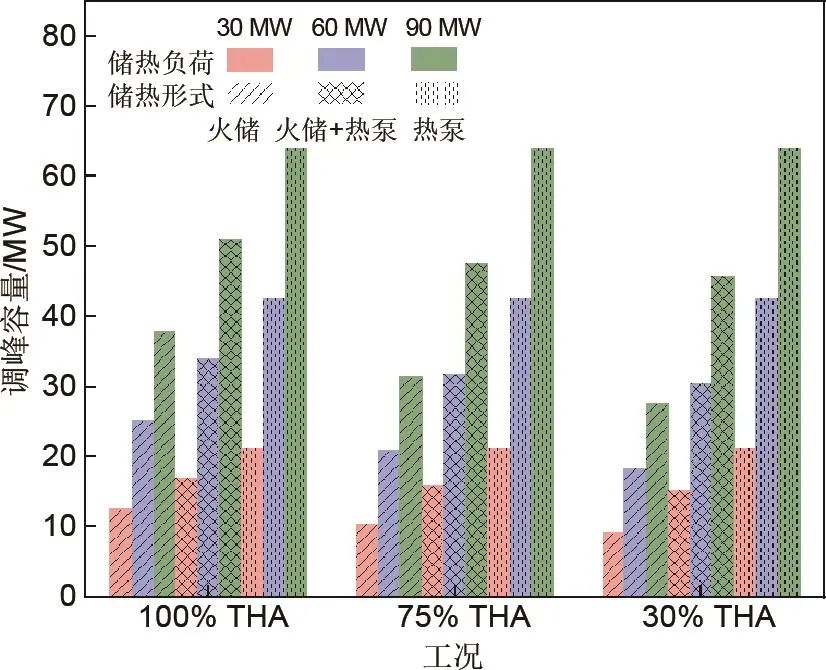 (1)對于儲能過程,耦合系統(tǒng)的調(diào)峰性能會隨著儲熱負(fù)荷的提高而增加,當(dāng)儲熱負(fù)荷為90 MW時,可以通過純熱泵儲熱方式獲得最高63.97 MW的調(diào)峰容量和10.65%的調(diào)峰深度。在電廠以高負(fù)荷運(yùn)行時,儲熱負(fù)荷越高,系統(tǒng)效率越低,且熱泵儲熱方式對系統(tǒng)效率的降低更為顯著。熱泵儲熱方式在調(diào)峰容量和調(diào)峰深度方面相較于火儲儲熱更具優(yōu)勢,其單位儲熱負(fù)荷的最大調(diào)峰容量相較于火儲方式可提高69%。