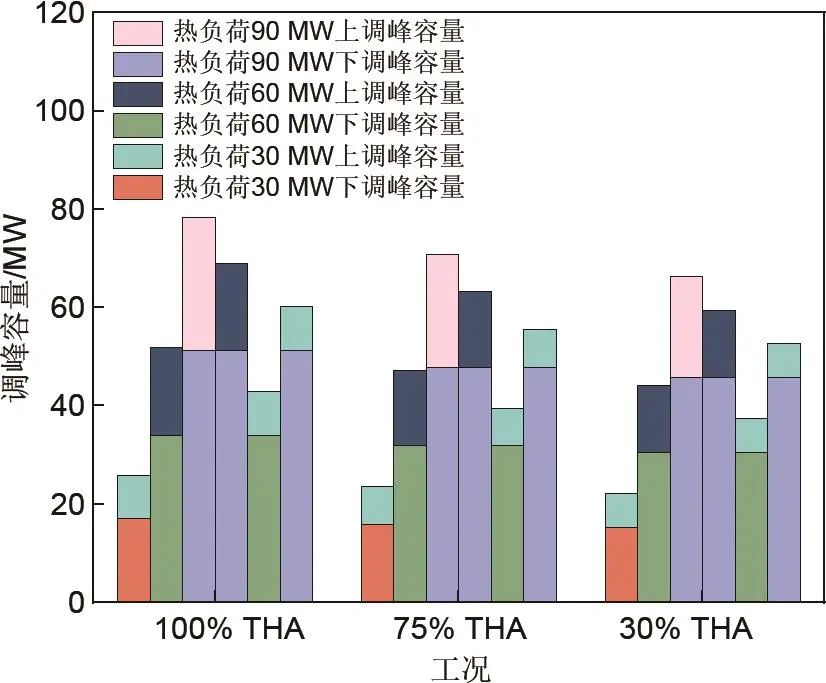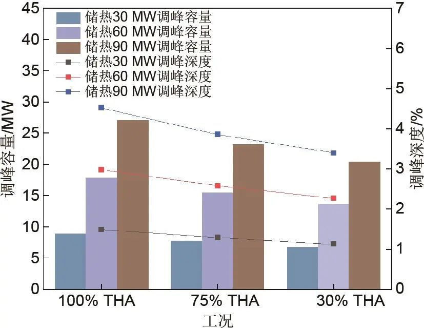 圖5和圖6分別為釋能過程中不同儲熱負(fù)荷下的系統(tǒng)效率,調(diào)峰容量和調(diào)峰深度。從圖5可以看出,由于熔鹽與蒸汽換熱時存在溫差損失,釋能過程耦合系統(tǒng)的效率相較于無儲熱的電廠熱效率更低,且隨著儲熱負(fù)荷的增加,釋能過程的系統(tǒng)效率逐漸減小。此外,當(dāng)電廠以更高的負(fù)荷運(yùn)行時,儲熱負(fù)荷的變化對于系統(tǒng)效率的影響更小,當(dāng)電廠為100%THA,儲熱負(fù)荷為90 MW時,耦合系統(tǒng)效率降低量僅為0.63%,而電廠為30%THA,儲熱負(fù)荷為30 MW時,耦合系統(tǒng)效率降低量則為2.05%。由圖6可以看出,釋能過程的調(diào)峰容量及調(diào)峰深度與儲熱負(fù)荷和電廠負(fù)荷均呈現(xiàn)正相關(guān)關(guān)系。釋能過程中,不同電廠運(yùn)行負(fù)荷下,單位儲熱負(fù)荷的調(diào)峰容量依次為0.30 MW,0.26 MW和0.23 MW。
