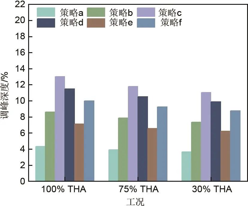 表2展示了根據(jù)儲/釋能過程中不同熱負(fù)荷制定的6種全過程運(yùn)行策略。圖7~9分別為火儲-熱泵聯(lián)合的儲熱形式在不同儲能釋能策略下全過程的系統(tǒng)效率、調(diào)峰容量和調(diào)峰深度。從圖7可以看出,儲能過程和釋能過程熱負(fù)荷相同時,耦合系統(tǒng)循環(huán)效率隨著儲熱負(fù)荷的提高而降低,但降幅較小,當(dāng)儲釋熱負(fù)荷為90 MW時,100%THA運(yùn)行的循環(huán)過程僅有0.16%的效率降低,而通過圖8和圖9可以看出,此時的調(diào)峰容量和調(diào)峰深度則可達(dá)78.29 MW和13.04%。因此,儲熱的增加對于電廠的靈活運(yùn)行是有利的。當(dāng)儲能過程熱負(fù)荷一定時,釋能過程熱負(fù)荷越低,耦合系統(tǒng)效率越高;當(dāng)釋能過程熱負(fù)荷一定時,儲能過程熱負(fù)荷越高耦合系統(tǒng)效率越高。這是由于釋熱過程中未利用的部分,可以作為備用熱源,用于其他場景。從圖8和圖9可以看出,儲/釋能過程熱負(fù)荷越高的策略,耦合系統(tǒng)的調(diào)峰容量和調(diào)峰深度也越大,如100%THA、75%THA和30%THA工況下的調(diào)峰容量和調(diào)峰深度最大的均為策略c,然而此時的系統(tǒng)效率在不同電廠運(yùn)行工況下均為最低。當(dāng)電廠以不同負(fù)荷運(yùn)行時,對于儲釋熱負(fù)荷相同的a,b和c三個運(yùn)行策略,其儲/釋能循環(huán)過程的單位熱負(fù)荷調(diào)峰容量依次為0.87 MW,0.79 MW和0.74 MW。