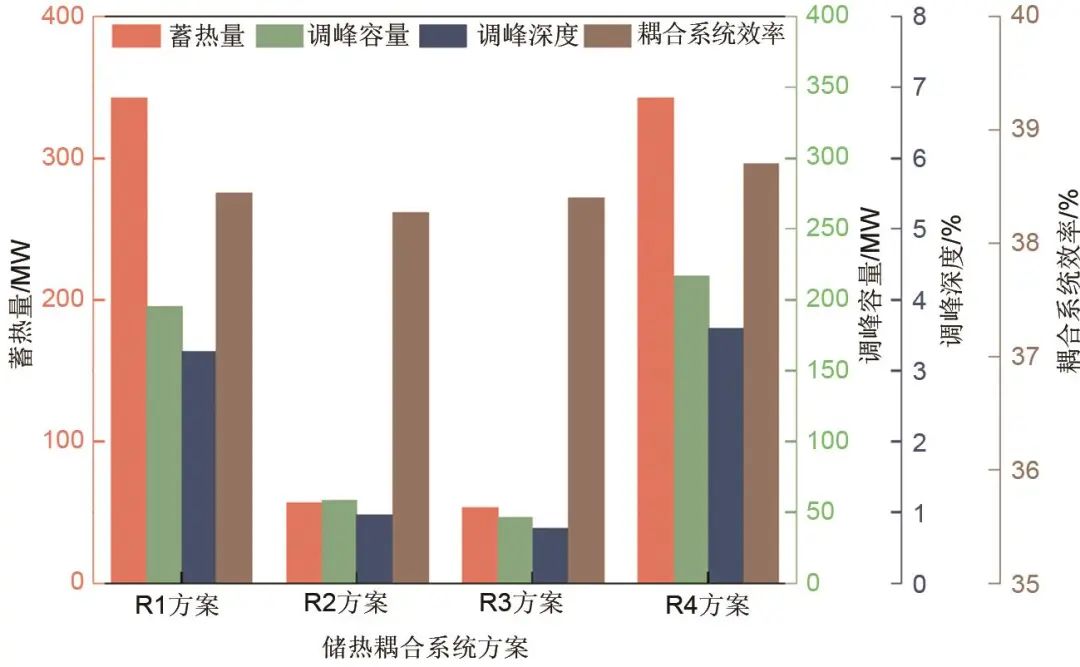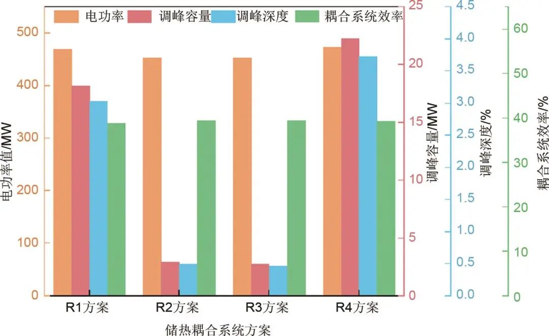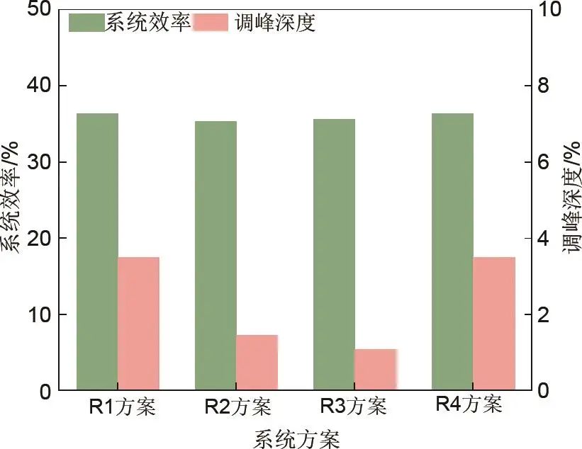 圖10和圖11展示了四種方案在30%THA工況下抽取相同蒸汽流量時耦合系統(tǒng)的電功率、調(diào)峰容量、蓄熱量、系統(tǒng)效率和調(diào)峰深度??梢钥闯觯?dāng)從中壓缸抽取再熱蒸汽,并在其放熱后返回除氧器時,會同時降低蒸汽在中壓缸和低壓缸的做功,導(dǎo)致汽輪機(jī)輸出功率降低顯著,為21.03 MW。但由于此時抽取的蒸汽放熱充分,因此調(diào)峰容量、調(diào)峰深度和蓄熱量更大。當(dāng)抽取主蒸汽或再熱蒸汽,并在其釋熱后返回低壓缸入口時,僅會降低蒸汽在中壓缸的做功,對汽輪機(jī)的輸出功率影響不明顯,如方案R3,僅能降低6.54 MW。此外,當(dāng)電廠以低負(fù)荷運(yùn)行時,更大的蓄熱量對耦合系統(tǒng)效率的貢獻(xiàn)更為顯著。在方案R1和R4中,其蓄熱量為68.51 MW,使得耦合系統(tǒng)效率相較于無儲熱配置電廠效率提高0.12%。儲能過程中,方案R1~R4的單位儲熱負(fù)荷的調(diào)峰容量分別為0.31 MW,0.77 MW,0.61 MW和0.31 MW??梢钥闯觯桨窻2的儲熱模式能夠以更低的儲熱負(fù)荷實(shí)現(xiàn)儲能過程中更高的調(diào)峰性能。