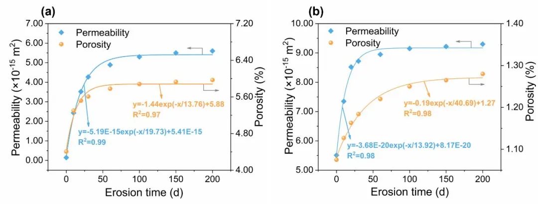 圖3 陽(yáng)極電解液MV侵蝕處理:(a)夾層樣品的孔隙度和滲透率與侵蝕時(shí)長(zhǎng)的關(guān)系;(b)鹽巖樣品的孔隙度和滲透率與侵蝕時(shí)長(zhǎng)的關(guān)系