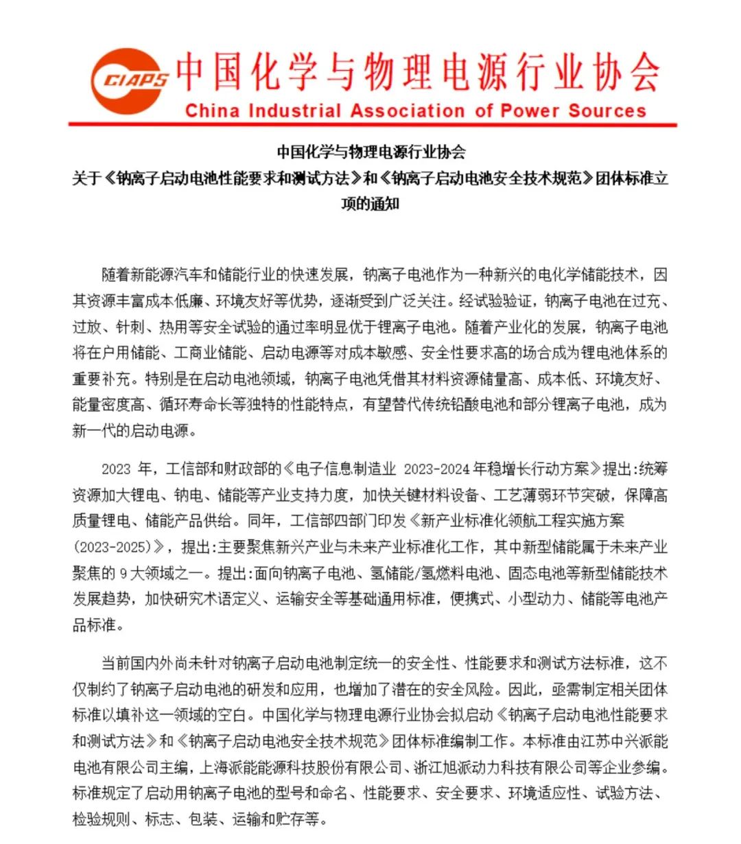 當(dāng)前國內(nèi)外尚未針對(duì)鈉離子啟動(dòng)電池制定統(tǒng)一的安全性、性能要求和測試方法標(biāo)準(zhǔn),這不僅制約了鈉離子啟動(dòng)電池的研發(fā)和應(yīng)用,也增加了潛在的安全風(fēng)險(xiǎn)。因此,亟需制定相關(guān)團(tuán)體標(biāo)準(zhǔn)以填補(bǔ)這一領(lǐng)域的空白。中國化學(xué)與物理電源行業(yè)協(xié)會(huì)擬啟動(dòng)《鈉離子啟動(dòng)電池性能要求和測試方法》和《鈉離子啟動(dòng)電池安全技術(shù)規(guī)范》團(tuán)體標(biāo)準(zhǔn)編制工作。本標(biāo)準(zhǔn)由江蘇中興派能電池有限公司主編,上海派能能源科技股份有限公司、浙江旭派動(dòng)力科技有限公司等企業(yè)參編。標(biāo)準(zhǔn)規(guī)定了啟動(dòng)用鈉離子電池的型號(hào)和命名、性能要求、安全要求、環(huán)境適應(yīng)性、試驗(yàn)方法、檢驗(yàn)規(guī)則、標(biāo)志、包裝、運(yùn)輸和貯存等。