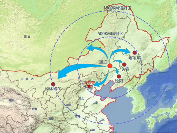 通遼市位于內(nèi)蒙古自治區(qū)東部,北部為大興安嶺南麓余脈的丘陵山地,南部為遼西山地邊緣的淺山丘陵,中部為西遼河沖積平原,平均海拔120~400米,總面積5.95萬平方公里,氣候?qū)僦袦貛Т箨懶约撅L(fēng)氣候,四季分明,年均氣溫0-6℃,年降水量350~400毫米,冬季受西伯利亞冷空氣影響更直接,低溫持續(xù)時(shí)間更長,有利于自然冷卻系統(tǒng)的穩(wěn)定運(yùn)行。地處環(huán)渤海經(jīng)濟(jì)圈、東北經(jīng)濟(jì)區(qū)和東北亞三角經(jīng)濟(jì)區(qū),是東北與華北的交匯中心,東與吉林省接壤,南與遼寧省毗鄰,西與赤峰市、錫林郭勒盟交界,北與興安盟相連,其周邊800千米范圍內(nèi)有15個(gè)百萬人口以上城市,距離出??阱\州港僅400千米,距離沈陽市、長春市約300千米。通遼市是國家“一帶一路”倡議向北開放的重要戰(zhàn)略節(jié)點(diǎn)城市,也是內(nèi)蒙古距離港口最近的城市,近年來,積極參與共建“一帶一路”和中蒙俄經(jīng)濟(jì)走廊建設(shè),深化與沿邊口岸和沿海港口城市協(xié)作,推動(dòng)保稅物流中心、多式聯(lián)運(yùn)海關(guān)監(jiān)管中心等開放平臺提能增效,跨境電商交易規(guī)模持續(xù)攀升。