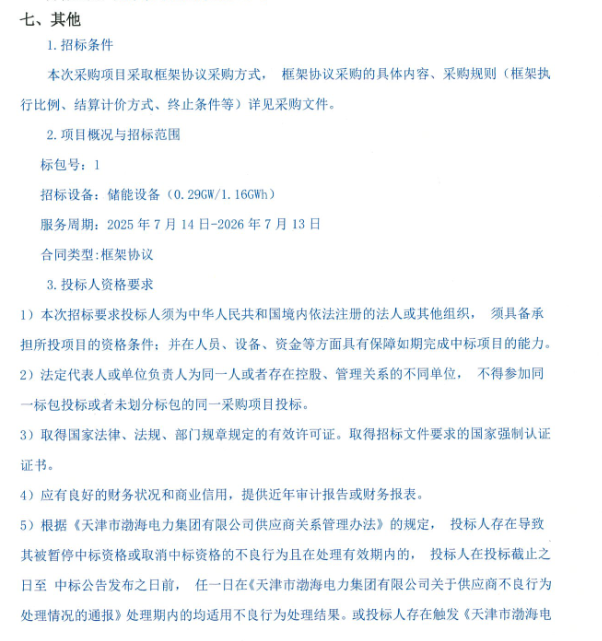 中國儲能網(wǎng)訊:6月23日消息,天津市渤海電力集團(tuán)有限公司發(fā)布2025年第二批設(shè)備類框架協(xié)議招標(biāo)采購招標(biāo)公告,項目所在地為天津,資金已落實。