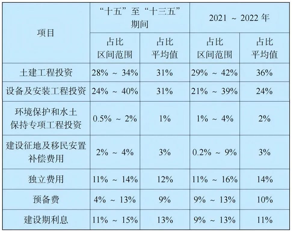 從表1可以看出,電站土建工程投資呈上升趨勢(shì);得益于我國機(jī)電設(shè)備水平不斷提升,設(shè)備及安裝工程投資占比下降;近年來環(huán)境保護(hù)要求日益提高,環(huán)境保護(hù)和水土保持專項(xiàng)工程投資占比略有上升;獨(dú)立費(fèi)和預(yù)備費(fèi)占比略有上升;利率水平不斷下降的情況下,建設(shè)期利息占比有所下降。成本結(jié)構(gòu)變化趨勢(shì)是合理的。
