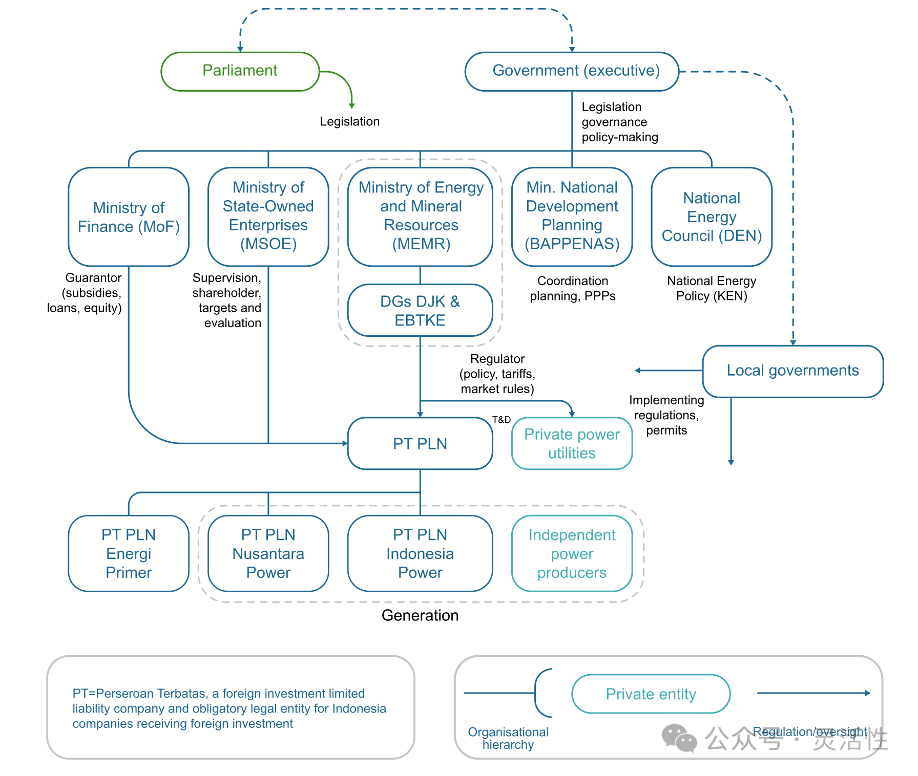 中央政府的各部委在監(jiān)管PLN和更廣泛的電力部門方面承擔(dān)不同的職權(quán)范圍——