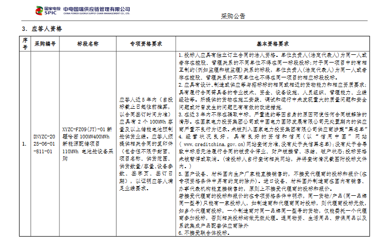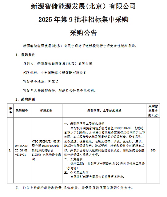 中國儲能網(wǎng)訊:國家電投子公司新源智儲能源發(fā)展(北京)有限公司發(fā)布2025年第9批采購,項目名稱為新疆哈密100MW/400MWh新能源配儲項目110MWh電池艙設備采購。項目資金來源已落實。