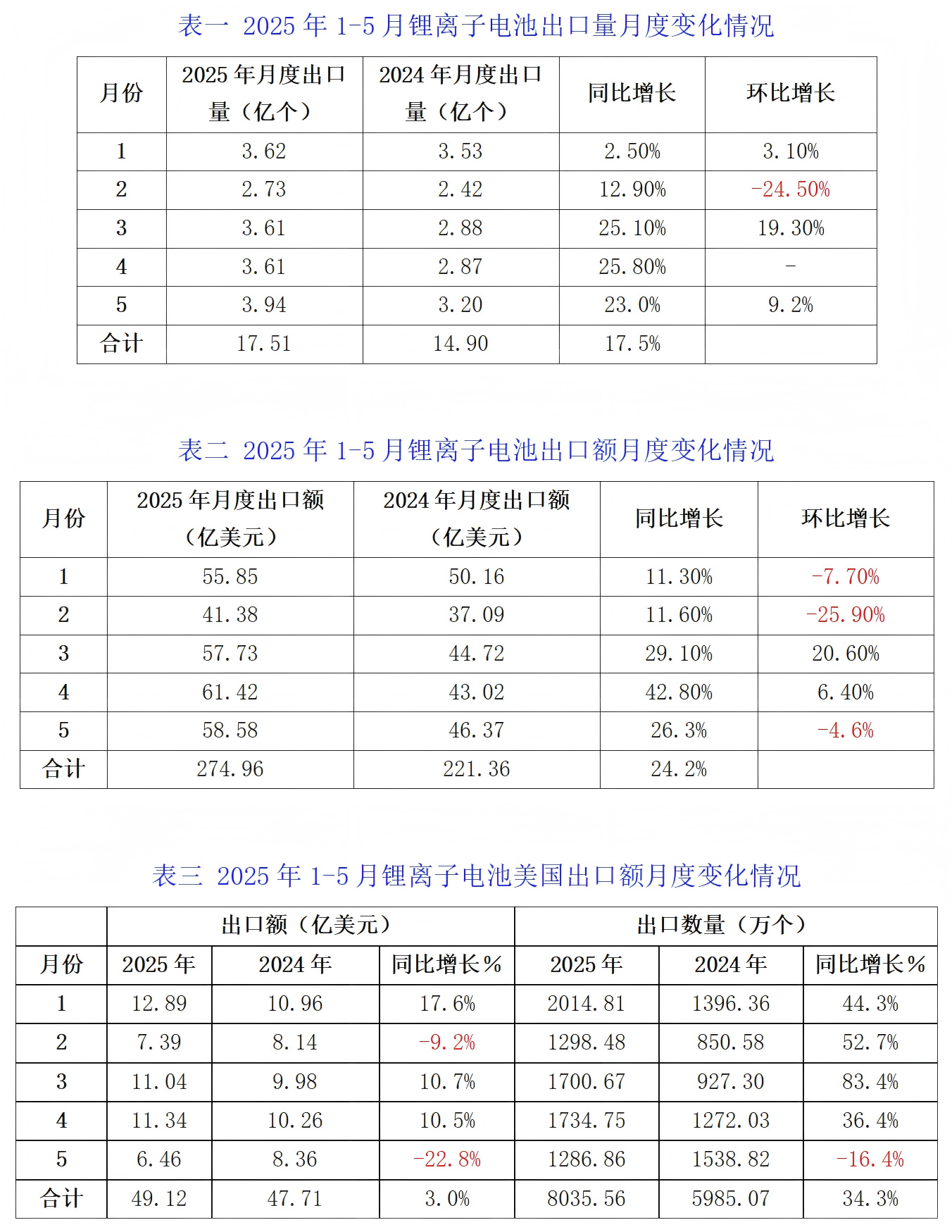 中國儲能網訊:根據海關最新統計數據,2025年1-5月鋰離子電池出口數量為17.51億個,同比增長17.5%;2025年1-5月我國鋰離子電池出口額為274.96億美元,同比增加24.2%,延續(xù)了穩(wěn)定增長勢頭。其中,2025年5月份,出口額58.58億美元,環(huán)比下降4.6%,5月份,出口數量為3.94億個,環(huán)比增長9.2%。出口總體呈現量增價跌趨勢。