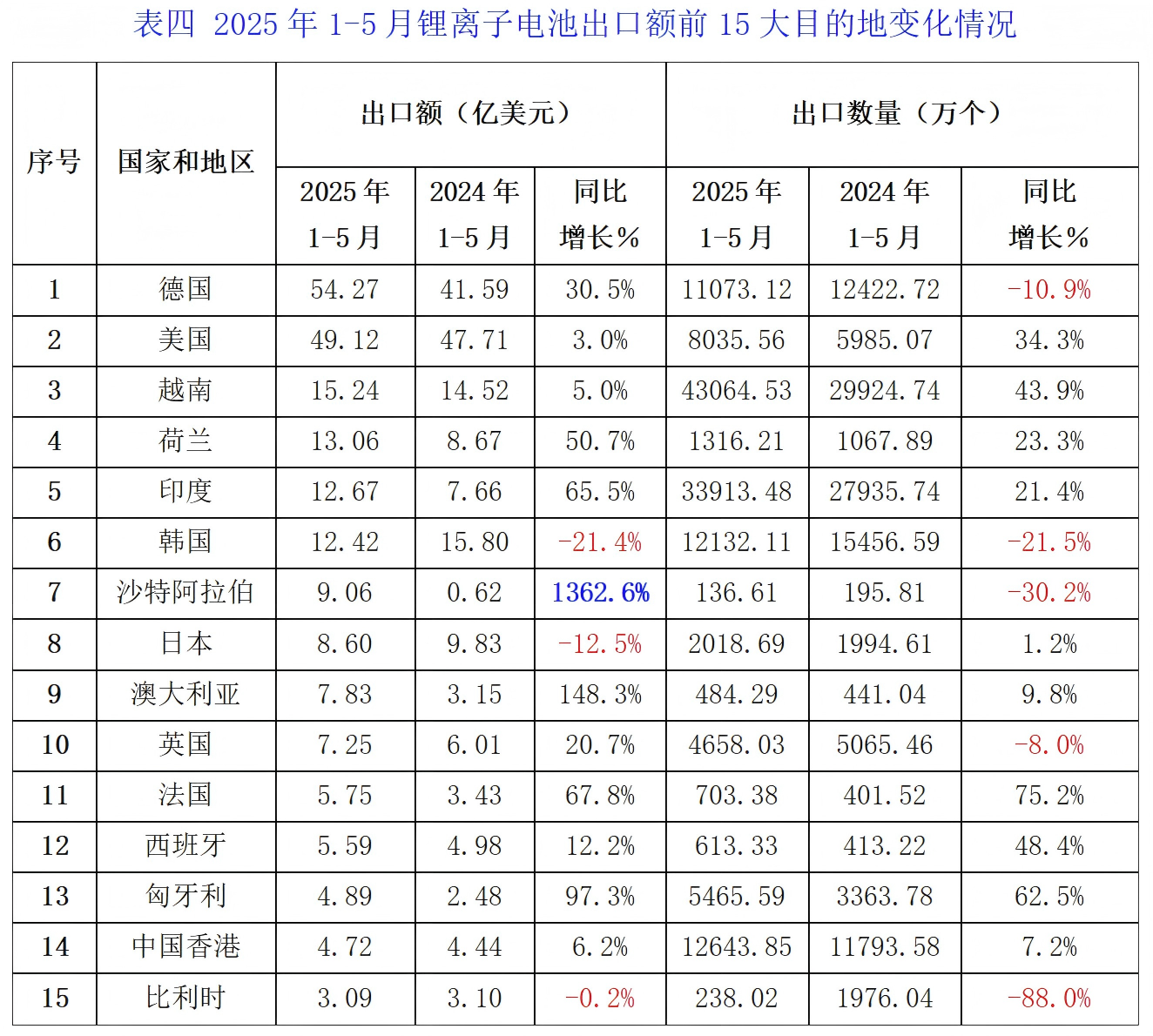今年以來,德國首次超越美國成為我國鋰離子電池第一大出口市場,2025年1-5月出口金額為54.27億美元,同比增長30.49%,占我國鋰離子出口總額的19.7%。這一變化源于德國車企電動化轉型的加速。大眾ID.7、寶馬Neue Klasse等主力電動車型的量產,推動了對中國高端動力電池的采購需求。僅2025年第一季度,中國對德動力電池出口就占到整個歐洲市場的52%。