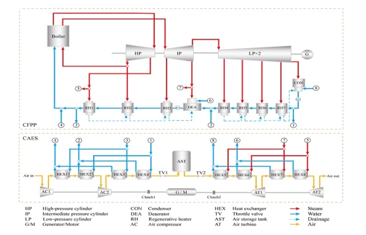 在新型電力系統(tǒng)轉(zhuǎn)型背景下,燃煤電廠作為重要的調(diào)節(jié)性資源,面臨著更高的調(diào)峰深度要求,以及低負(fù)荷運(yùn)行時易發(fā)生脫硝系統(tǒng)失效、系統(tǒng)能耗增加等行業(yè)亟待解決的重要問題。本研究開發(fā)了一套適用于新一代煤電的物理儲能耦合系統(tǒng),創(chuàng)新性地將物理儲能余熱應(yīng)用到提升脫硝系統(tǒng)工作溫度的場景中,通過雙級壓縮和膨脹工藝優(yōu)化實(shí)現(xiàn)高效能量轉(zhuǎn)化。同時,該技術(shù)有效解決了物理儲能系統(tǒng)充放電過程熱利用平衡問題和燃煤電廠低負(fù)荷下運(yùn)行脫硝系統(tǒng)低溫失效問題,耦合系統(tǒng)的儲能循環(huán)往返效率高達(dá)85.1%,相較于獨(dú)立運(yùn)行物理儲能系統(tǒng)效率提升了13.5%,度電成本降低了23%,顯著提高了鍋爐脫硝系統(tǒng)在低負(fù)荷下的工作溫度和運(yùn)行可靠性。