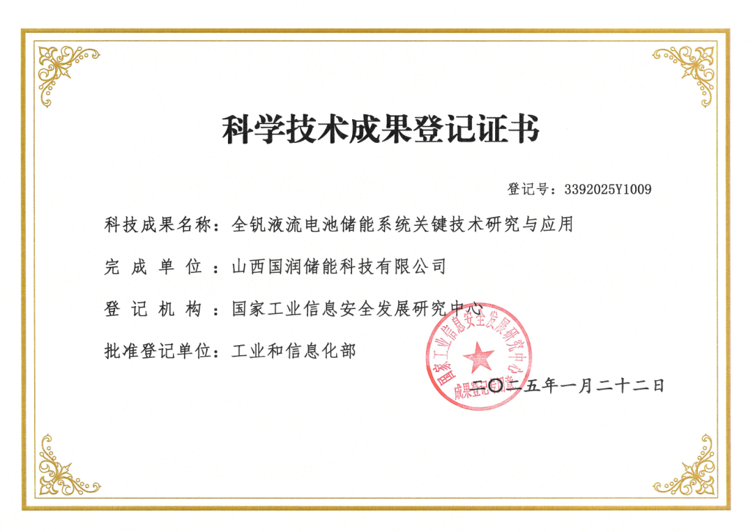 經(jīng)認(rèn)證報(bào)告評定,國潤儲(chǔ)能全釩液流電池儲(chǔ)能系統(tǒng)整體技術(shù)水平達(dá)到國內(nèi)領(lǐng)先,各項(xiàng)關(guān)鍵指標(biāo)及技術(shù)達(dá)到國際先進(jìn)水平。對開發(fā)商用釩液流電池的應(yīng)用起到了支撐作用。經(jīng)濟(jì)、社會(huì)效益顯著,應(yīng)用前景廣闊。
